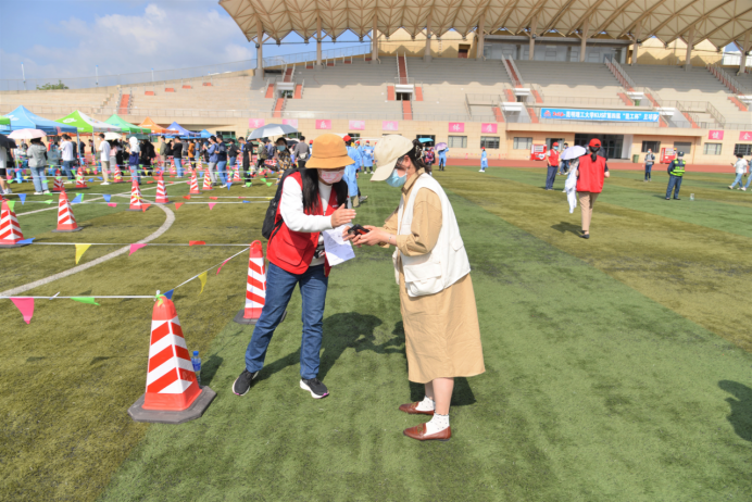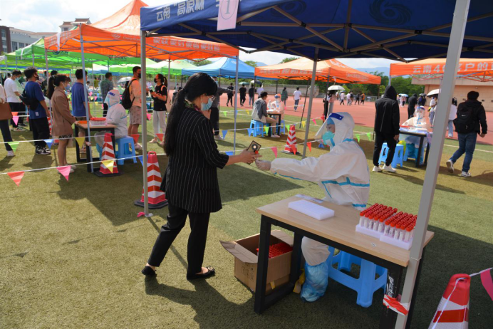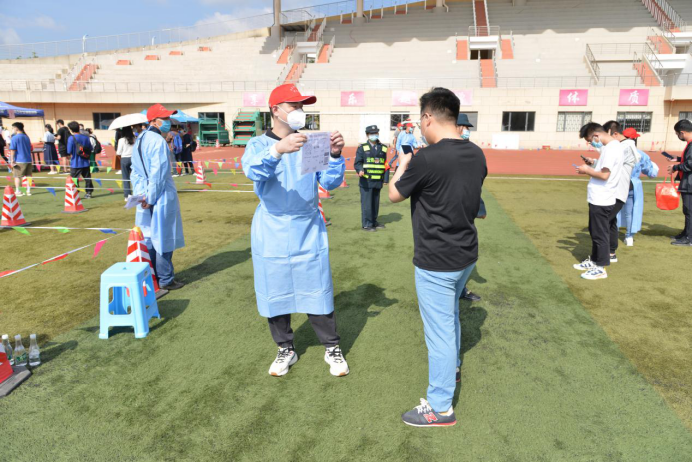 检测当日,晴空万里。顶着炎炎烈日,信自学院48名教师党员志愿者“全副武装”,化身“大白”、“小蓝”,在各个检测道口为全校师生录入并核对检测人员信息、发放核检测酸试剂管、维持队伍秩序。