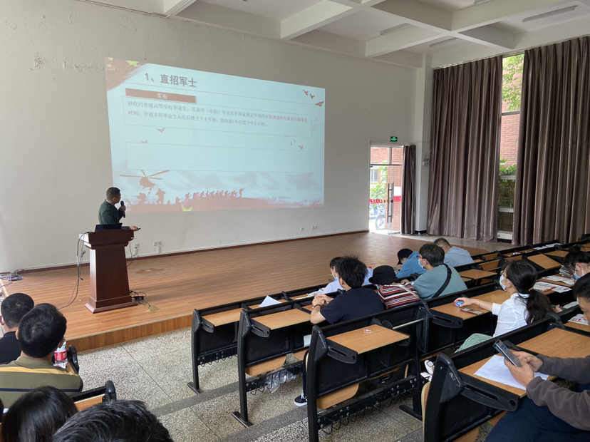2022年5月27日,信自学院召开2022年下半年第二次征兵宣传动员大会,此次大会邀请学校武装部征兵宣传团进行宣讲,校学生工作副部长梁胜光,信自学院党委副书记周鹭、学工办主任郑婷婷、2022届毕业班班主任及未就业学生参加大会。