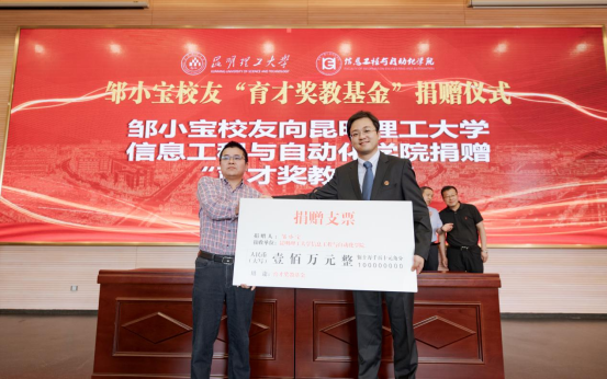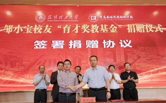 在学校图书馆蓝色报告厅举行邹小宝校友“育才奖教基金”捐赠仪式。为支持和推动昆明理工大学教育事业的改革和发展,助力信自学院内涵发展,提升学院思政育人水平和科学研究能力,浙江纳轩私募基金管理有限公司董事长、信自学院98级自动化专业邹小宝校友捐赠壹佰万元设立“育才奖教基金”,其中陆拾万元用于奖励工作成绩突出的班主任、辅导员,肆拾万元用于奖励科研成果业绩显著的教师。