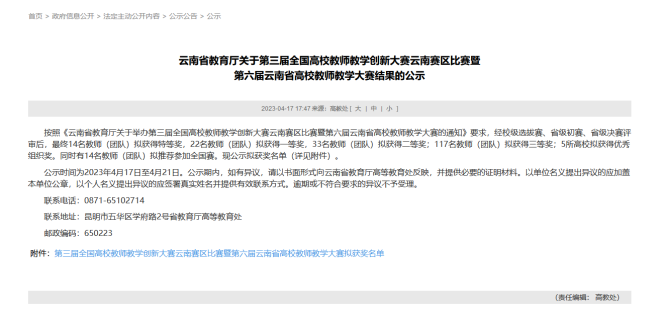 4月17日,云南省教育厅发布了《云南省教育厅关于第三届全国高校教师教学创新大赛云南赛区比赛暨第六届云南省高校教师教学大赛结果的公示》。捕鱼游戏网页版