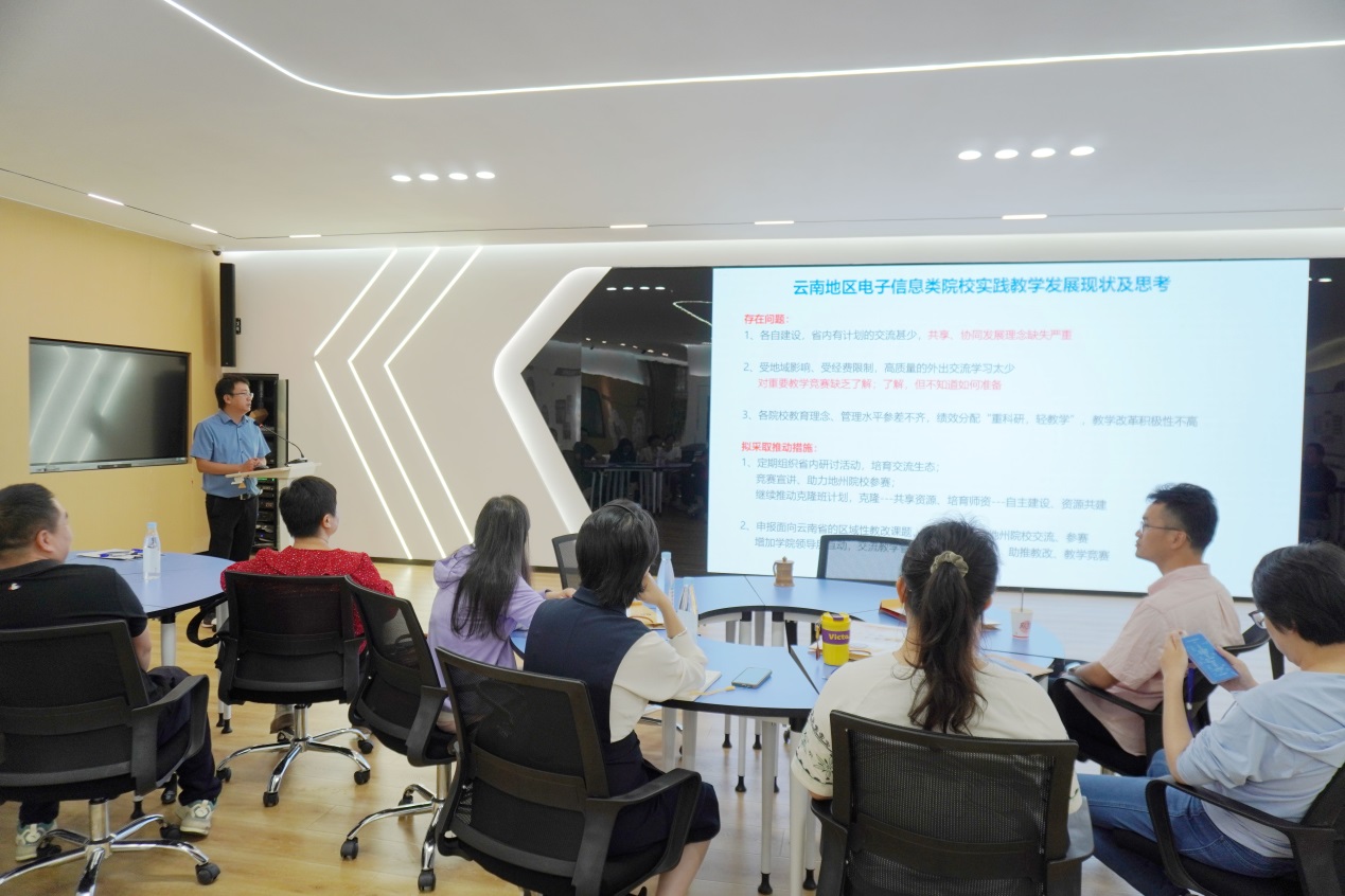 在交流研讨环节,来自昆明理工大学的刘静老师、曲靖师范学院的曾秀花老师分别作了《电工电子实验教学案例竞赛参赛经验分享》和《电子信息类专业课程实验教学案例设计竞赛参赛历程与经验分享》专题报告。参会教师们参观了我校电工电子实验室,并围绕电子信息类实践课程建设新方法,持续推进实践课程建设思路、体系和模式改革创新,提升实验课程教学质量进行深入探讨。本次研讨会的举办加强了云南省内电子信息类人才培养院校的交流合作,将持续推动电子信息类拔尖创新人才培养高质量发展。