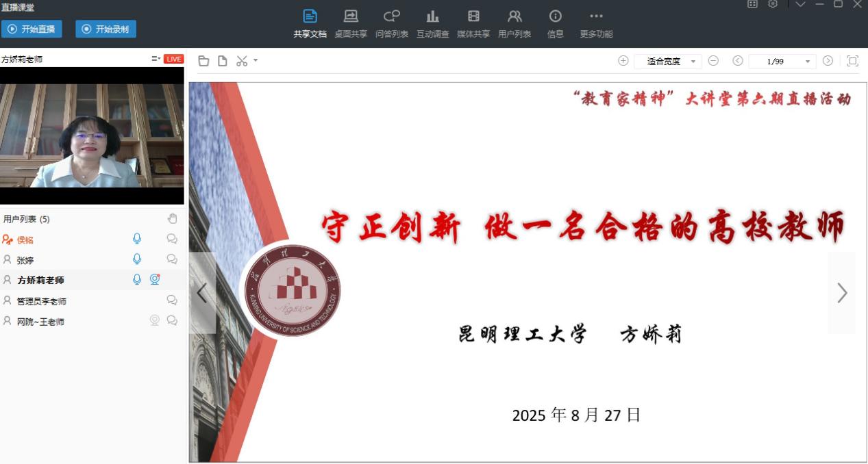 昆明理工大学始终坚持把教师队伍建设作为提升办学质量的核心抓手,通过完善“引育留用” 一体化机制、搭建多层次教学科研创新平台、开展常态化师德师风建设等举措,培养出一批批政治素质过硬、业务能力精湛、育人水平高超的优秀教师。方娇莉老师作为昆明理工大学教师队伍的杰出代表,在多年的教学实践中,深耕学科领域、创新教学方法,不仅在课程建设、教学改革等方面取得显著成效,更以深厚的教育情怀、扎实的专业能力赢得学生与同行的广泛赞誉,其教育理念与实践经验充分契合“教育家精神” 的核心内涵,为广大教师树立了优秀典范。值此第41个教师节来临之际,国家教学行政学院邀请方娇莉老师做“教育家精神”大讲堂直播培训,既是对教师群体的节日致敬,更是对昆明理工大学优秀教师专业素养与育人实践的高度认可。