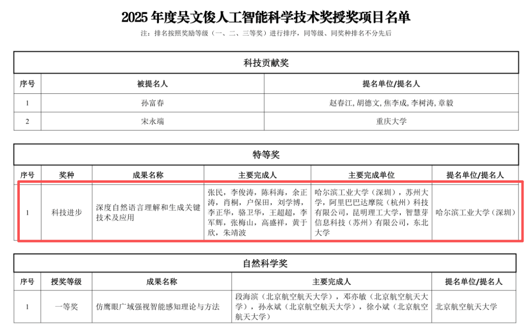 此次荣获特等奖的“深度自然语言理解和生成关键技术及应用”项目,由哈尔滨工业大学(深圳)、苏州大学、阿里巴巴达摩院(杭州)科技有限公司、昆明理工大学、智慧芽信息科技(苏州)有限公司、东北大学等单位共同完成。主要完成人包括张民、李俊涛、陈科海、余正涛、肖桐、户保田、刘学博、李正华、骆卫华、王超超、李军辉、张梅山、高盛祥、黄于欣、朱靖波等。