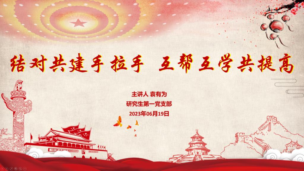 为加强学校党组织内外优势互补,构建“资源共享、优势互补、互相促进、共同提高”的党建工作新格局,切实加强党内工作经验交流,充分发挥基层党组织的战斗堡垒作用和党员的先锋模范作用。研究生第一党支部于2023年06月19日开展以“结对共建手拉手,互帮互学共提高”为主题的党日主题活动。本次活动由王爱坤同志主持,并由袁有为同志带领党支部全体学生党员学习。