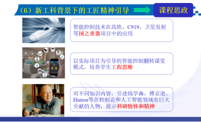 在教学过程中,特别注重课程思政的建设,通过典型的教学案例、被控对象,以及爱国科学家的故事、数十年如一日孜孜不倦进行科研工作的科研故事等案例,提高学生的工匠精神、爱党爱国情怀、以及民族自豪感等。