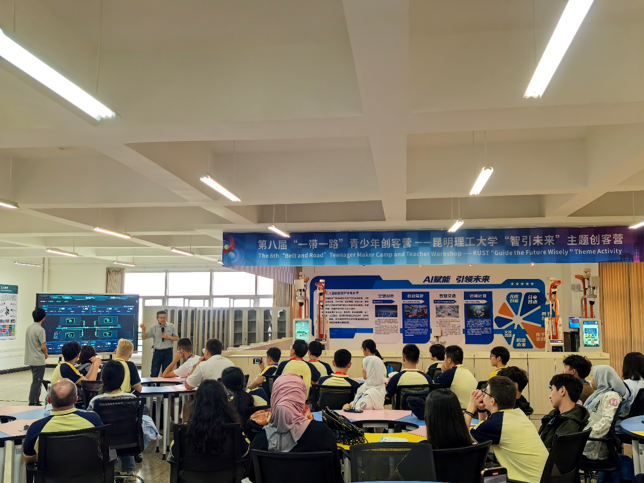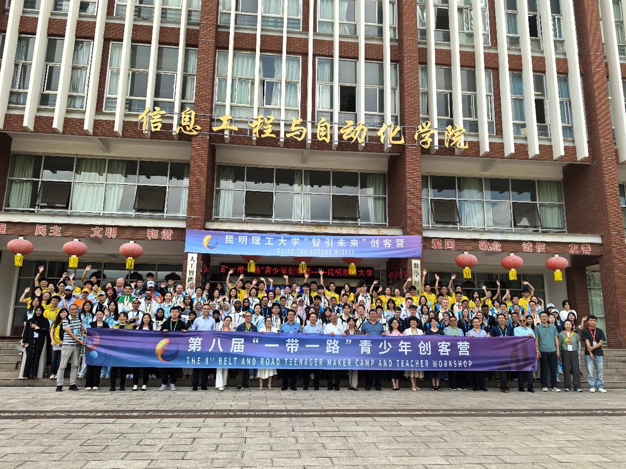 (人工智能产业学院)承办的第八届“一带一路”青少年创客营 ——昆明理工大学“智引未来”主题创客营项目在信自楼前广场成功启动。昆明理工大学副校长牛昱宇、云南省青少年科技中心副主任徐薇、信自学院党委书记齐毅、党委副书记郑婷婷、副院长李恒、副院长金怀平、团委老师、 “一带一路”青少年创客营11个国家和地区的83名师生,以及学院青协志愿者等共计100余人参加了本次项目的启动仪式。